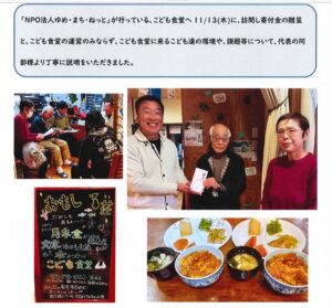 11月13日こども食堂「ゆめ・まち・ねっと」、11月15日こども食堂「フラワー」の2ヵ所を訪問しました。