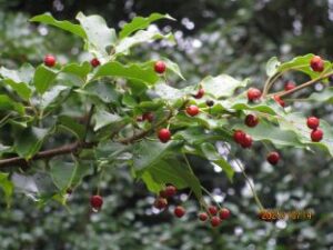 小雨決行、スタート時は傘が目立ちます ウォーキングというよりお散歩 雨上がりの芝や赤い実が美しい